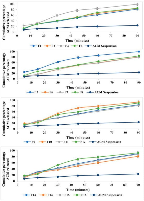 The in vitro releases of the sixteen ACM-loaded formulations (Figure 5) were evaluated at multiple time intervals (5, 15, 30, 45, 60, and 90 min). All formulations exhibited a time-dependent release pattern, with the cumulative percentage of ACM released increasing progressively over time.