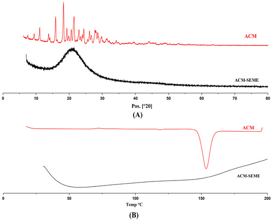 DSC analysis of both ACM and dried ACM-SEME was carried out using a Shimadzu DSC-60 (Japan). Samples (2–4 mg) were accurately weighed and placed in an aluminum pan and heated at the rate of 10 °C/min to a temperature of 200 °C. The instrument was calibrated with indium, and nitrogen was used as purge gas through DSC cells with a flow rate of 30 mL/min.