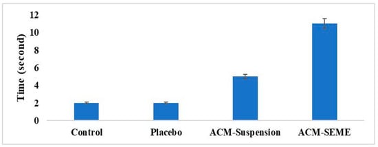The antinociceptive activity of the formulations was evaluated using the Eddy’s hot plate method. Male Wistar rats (180–200 g) were divided into four groups (n = 6 each): (i) negative control (no treatment), (ii) placebo (blank SEME formulation), (iii) positive control (ACM suspension, equivalent to 5 mg/kg), and (iv) test group (ACM-SEME, equivalent to 5 mg/kg). Thirty minutes after oral administration, each rat was individually placed on a hot plate maintained at 50 ± 0.5 °C, and the latency time until the first nociceptive response (hind paw licking, withdrawal, or jumping) was recorded. A cut-off time of 30 s was applied to prevent tissue injury. Increased reaction latency compared with the negative and placebo groups was considered evidence of analgesic efficacy [,]. The study was conducted at the College of Pharmacy, University of Baghdad, and received ethical approval from the college’s Research Ethics Committee (Approval number: REC032440R). All animals were handled in accordance with the guidelines for the care and use of laboratory animals, as outlined by the US National Institutes of Health (NIH Publication No. 85-23, revised 1996). Before the study began, the animals were fasted from food but had unlimited access to water for the whole night.