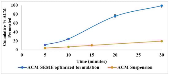 In vitro release profiles of ACM-SEME formulations compared with ACM suspension in phosphate buffer (pH 6.8, n = 3, mean ± SD).