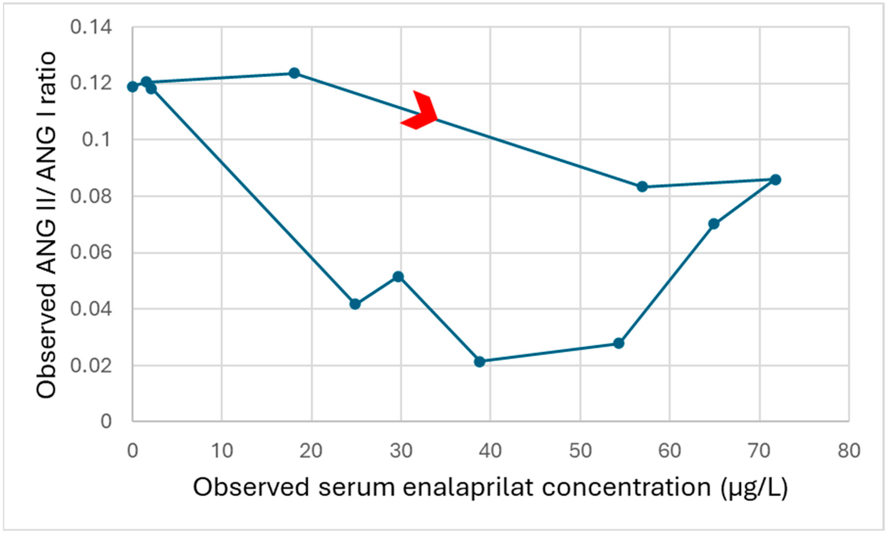 Effect concentration curve of a healthy adult subject. The points in the plot are connected in chronological order of measurement. The first measurement was the one with an observed serum enalaprilat concentration of zero. The red arrow indicates the direction of the chronological order. ANG I, angiotensin I; ANG II, angiotensin II.