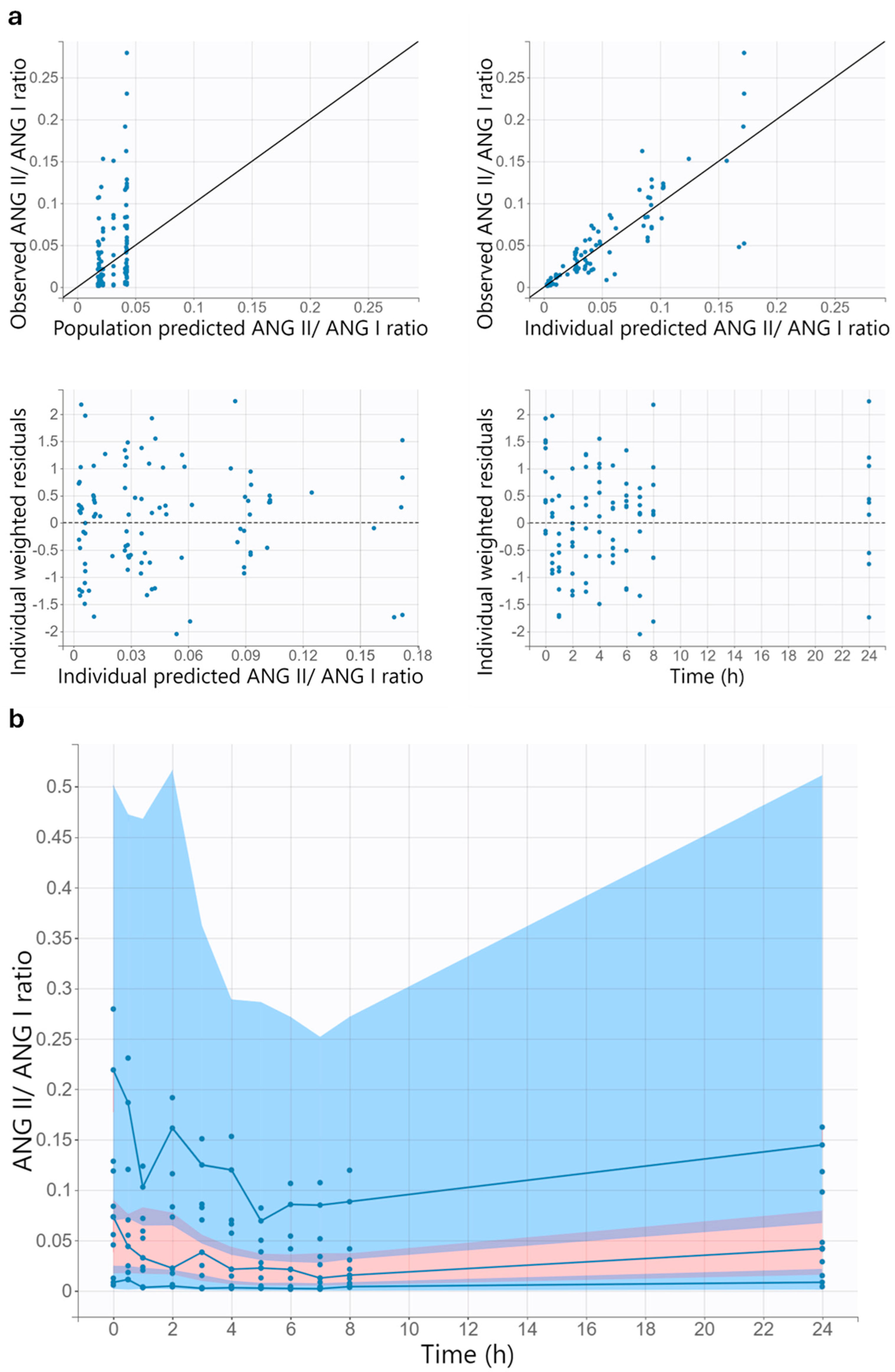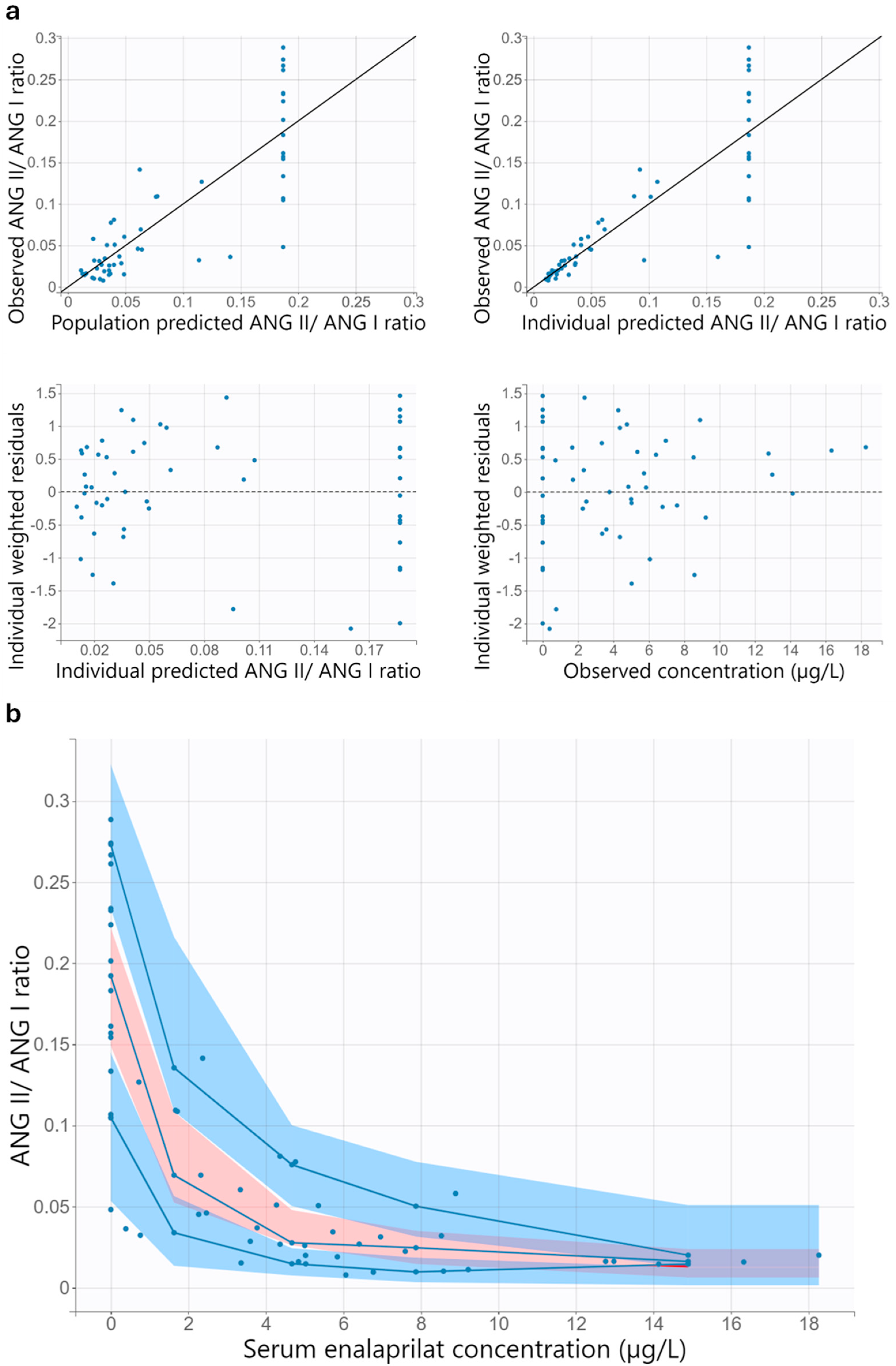 Goodness-of-fit plots (a) and visual predictive check (b) for the final pharmacodynamic model for the children with heart failure. All concentrations mentioned in the figure refer to the enalaprilat concentration. In all diagrams, the blue dots indicate the observed data. In the two upper diagrams in (a), the solid black line is the line of unity. In the two lower diagrams in (a), the dashed black line represents the theoretical mean. In the visual predictive check (b), the solid blue lines with blue dots are the 10th, 50th, and 90th percentiles of the observed data. The shaded areas represent the 90% prediction intervals of the 10th (blue), 50th (pink), and 90th (blue) percentiles of the simulated data. The purple areas are the areas where the 90% prediction interval of the 50th percentile of the simulated data overlaps with the 90% prediction interval of the 10th or 90th percentile of the simulated data. Red areas indicate the areas where the empirical percentile lies outside the prediction interval. ANG I, angiotensin I; ANG II, angiotensin II.