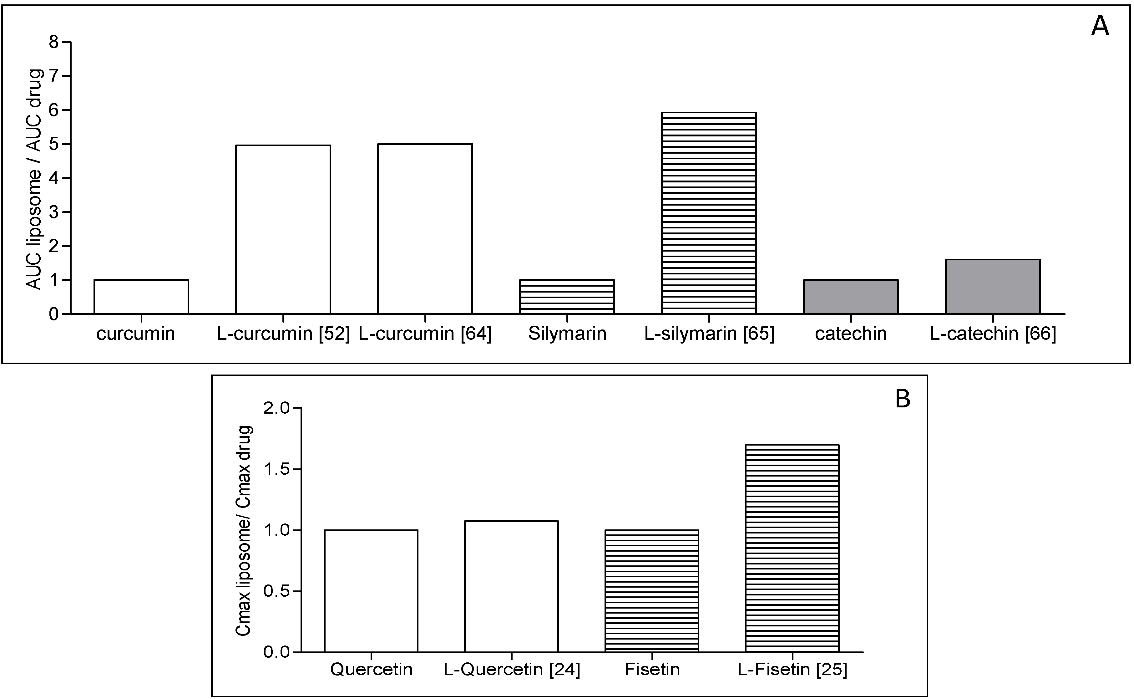 Concerning the in vivo situation, the advantage of the polyphenol liposomal formulation has been shown in several studies. Oral bioavailability is often improved with liposomes, as shown with catechin, dehydrosilymarin, quercetin, puerarin and silymarin (cf. Table 1). We tried to evaluate in this review the benefit of incorporating polyphenol into liposomes in terms of the concentration found in the plasma, as compared to free polyphenol. Based on the area under the curve (AUC) data given in the literature, we artificially fixed the level of free polyphenol at one and implemented the level of the polyphenol under its liposomal form found in the plasma (Figure 2). For example, liposomal catechin administered orally was found to increase by a factor of 1.6 area under the curve (AUC) of the catechin in the plasma as compared to the free drug. Takahashi et al. [62] observed an enhancement of a factor of five when curcumin was administered orally into liposomes, as compared to curcumin alone or to a mixture of curcumin and lipids used in the formulation (Figure 2A). Basically, for the free polyphenol described, a factor of 1.6 to five was obtained in favor of the liposomal form.