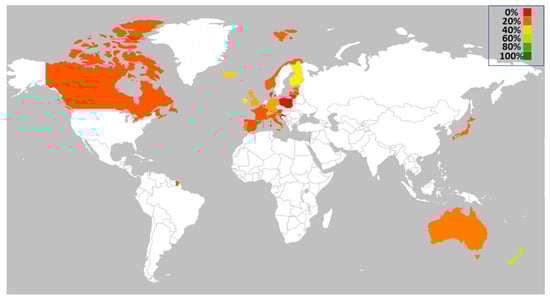 Many nations (e.g., Singapore, South Korea, Taiwan, Hong Kong, China) promptly adopted CT at the beginning of the pandemic [,,], mainly due to the fact that they have already used this type of system in other outbreaks (including HIV, syphilis, and swine flu; []). For instance, Singapore was one of the first nations to introduce digital tools for tracing COVID-19 (GoS, TraceTogether, url: https://www.tracetogether.gov.sg/ (accessed on 20 May 2021)). Until May 2021, 37 countries relied on or used CT apps to deal with COVID-19 with different degrees of adoption by population (Figure 1) [,]. As reported in Figure 1, CT systems have been particularly adopted in countries such as Finland, Ireland, Germany, UK, Switzerland, and Iceland. Notably, the countries that had the highest level of adoption were Singapore (92%) and New Zealand (55%).