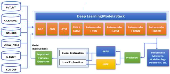 Many research studies have been performed on anomaly detection where researchers report their model settings and performance measures. Our proposed methodology overcomes some of the important limitations in previous research studies, where researchers do not report their proposed model’s output itself but what features contributed to the model to make certain predictions or influence the overall model performance. Similarly, many previous research studies generate bias results due to training the models only on a single dataset consisting of a limited network traffic pattern. A single dataset does not classify a vast range of attack classes and may lack recent traffic patterns []. This paper explores the output of various DL models by implementing SHAP and LIME, analyzing predictions, finding commonalities to avoid bias, improving classifier quality and reliability, and extracting top contributing features that influenced the model predictions most. Figure 1 depicts the proposed framework overview.