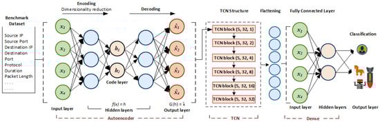 Our experiments involve various datasets and DL models. To preserve the space, we only present the architecture of one of our hybrid models, “Autoencoder + TCN,” in Figure 2. The same architecture has been used for other hybrid model implementations shown in Figure 1. In other implementations, we replaced the “TCN Structure” block in Figure 2 with LSTM, BRNN, or BLSTM. Model-specific settings are reported in Table 2 (individual classifiers) and Table 3 (hybrid classifiers). In this architecture, first, the autoencoder takes the input shape of the dataset, reduces its dimensions to a smaller size (also known as latent space) and then reconstructs the original data from the compressed representation. Autoencoders generate reconstruction errors and guarantee very high accuracy with low latency detection []. The output of autoencoders is passed into a TCN structure. The pooled outputs of TCN block layers are flattened into a one-dimensional array and are passed to a fully connected layer. The last layer is passed with total output classes using the “softmax” activation function to make predictions on each label.