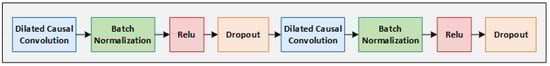 where “filters” are similar to units in LSTM, and they affect the model size. A larger filter size is preferred. It helps to train the model in parallel and faster, unlike RNN and LSTM, where predictions must wait for the predecessor results []. In TCN, a longer input sequence can be processed as a whole instead of sequentially. The “kernel_size” parameter determines the size of each filter in each convolution layer. It helps to calculate how much of the input is used to calculate each value in the output. A larger kernel_size helps detect complex features. The “dialation_rate” parameter represents a fixed step between two adjacent filters. A “dilation_size=1” is the same as a regular convolution in a CNN network. A larger dilation rate captures a bigger input range on the top convolution layer, making a TCN more receptive []. Our TCN structure starts with a CONV1D dilated causal convolution layer, followed by a batch normalization layer to obtain high accuracy values and increase model training. We then implemented a Rectified Linear Unit “Relu” to allow quick network convergence. We then added a “Dropout” layer to avoid over-fitting and added regularization by randomly dropping 30% of weights connected to certain nodes during the training process. The same layer structure was repeated in the TCN block and is shown in Figure 3.