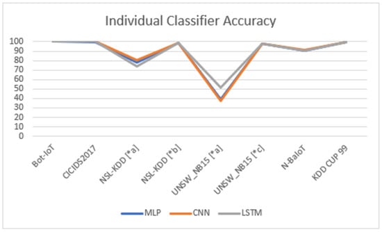 Table 2 shows that the LSTM model requires over 3 million trainable parameters, thus requiring a longer training time than MLP and CNN. Running the model on UNSW_NB15 (*c) requires over 8.5 h, making it an expensive algorithm for a resource-constrained IoT environment. Figure 4 compares the accuracy comparison of each of the classifiers. All three algorithms return similar accuracy, with LSTM performing slightly better on the UNSW_NB15 (*a) dataset.