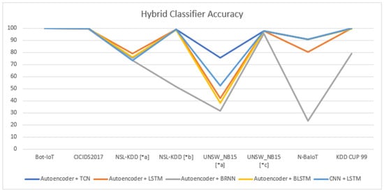 Figure 5 shows the accuracy comparison of each of the hybrid classifiers. “Autoencoder + TCN” returns better accuracy compared to other algorithms. “Autoencoder + BRNN” returns very low accuracy with only 23.30% on N-BotIoT and 31.90% on UNSW_NB15 (a*) datasets. Model training time is also an important concern in a live environment. As shown in Table 3, algorithms such as “CNN + LSTM” took over 9 h to converge on UNSW_NB15 (*c) dataset. Models that converge faster can be trained multiple times during the day with new attack information to keep them up-to-date.