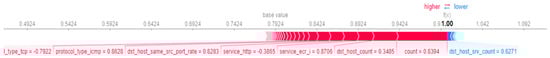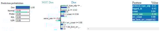 We performed two analyses to look for a suitable measure of feature importance. SHAP and LIME provide a localized explanation of a specific prediction. Both local and global explanations show the complexity of models when making predictions. SHAP local explanation in Figure 6 visually shows the features considered important by the classifier in making an individual prediction. The prediction reflects the probability that the input traffic is a DOS attack. Results showed that the base value of 79.24% (model’s average prediction over the training set) would be predicted if the features to the current output f(x) were unknown. However, the classifier was able to predict the DOS attack with 100% accuracy. The top features that predict the attack are shown in red color and are count, dst_host_count, service_ecr_i, service_http, etc., whereas the blue features dst_host_srv_count drives the prediction value lower. The larger arrow size of the count shows the magnitude of this feature’s effect on making a classification decision.