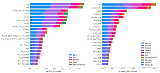 where  refers to the Shapely value for feature j in the i-th data; N is the total number of samples in the dataset; and I_j is the average Shapley value of the feature j. Briefly, Figure 8a depicts dur as the most important feature followed by sum, N_IN_Conn_P_DstIP, etc., in the BoT_IoT dataset. Similarly, Figure 8b depicts sttl as the most important feature, followed by ct_state_ttl, dttl, smeansz, etc. Further details and analysis of which features each classifier considered important are presented in Section 4.3. Global explanation helps to refine further models towards building an online IDS, which can look at only a limited set of network traffic features to make decisions quickly in an unsupervised manner.