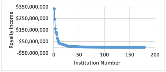 To model a venture capital portfolio, the payoff structure from pooled data for 509 startups from 1995–2009 was used []. The makeup of a TTO’s IP portfolio can be defined similarly to a VC’s startup portfolio: