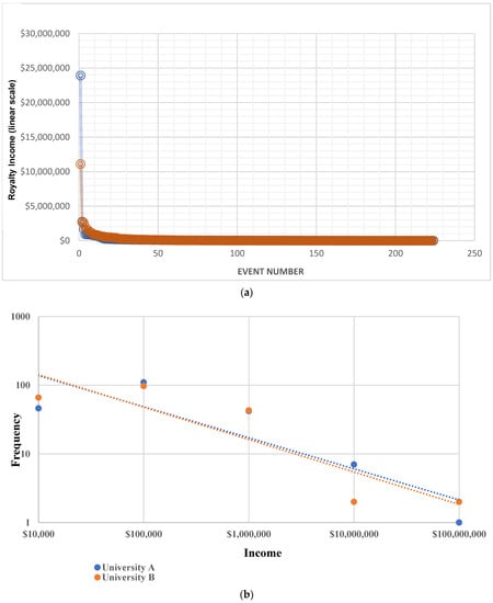 Two very different US research universities, yet, the two schools’ royalty incomes are similar and can be modeled as power-law distributions. (a) Event number vs. royalty income; (b) income vs. frequency.