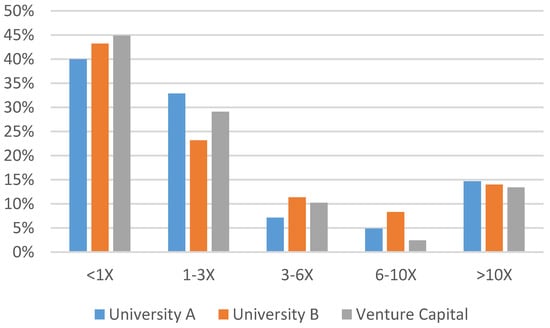 The academic portfolios in this study do not include patented technologies that generated zero income. This is an essential point since unlicensed technologies can comprise a high percentage of the patent portfolio. This will be discussed later in regard to how this might impact a TTO’s ability to break even. It is essential to mention that the academic and venture portfolio returns are so similar in Figure 5. If the academic data set had included patented and unlicensed cases, the percentage distribution in the < = 1 category would have been much more significant. To calculate the academic return, an estimate of the fully loaded cost of filing a patent was used. For example, if patent prosecution costs are USD 20,000 and approximately half of the TTO’s budget is prosecution costs, then the fully loaded cost of filing is estimated to be USD 40,000.