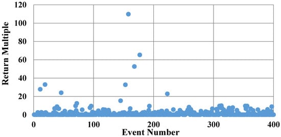 Once the return make-up of a portfolio was defined (e.g., 63.1%, 19.6%, 9.2%, 4.3%, and 3.7%) and the “tail” or high-income part of the distribution (>10×) was matched to a power-law distribution (e.g., α = 2.0 typical for a VC fund), then a Monte Carlo simulation of individual event returns [,] was generated, see Figure 6. For practical purposes, it was assumed that the power-law return distribution is limited to 10× through 150×. The summation of 10,000 individual Monte Carlo simulation return events will make up the portfolio’s total return.