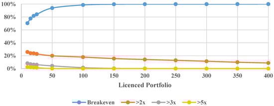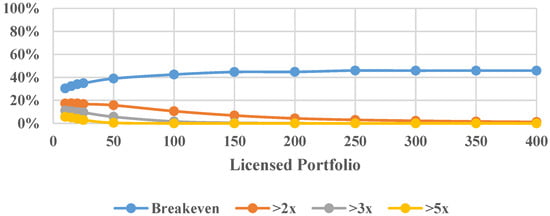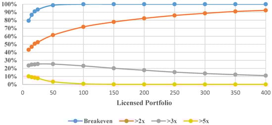 Figure 8 illustrates the impact that portfolio quality has on a portfolio’s probability of making a 2× or higher return. Reducing the number of power-law events will have a significant impact on the portfolio’s potential total return. However, going to a lower-quality portfolio (power-law events occur at a 1% frequency), the portfolio breaks even, except for very small portfolio sizes. If all power-law events were eliminated, the average return is slightly over 1×. This is why the portfolio breakeven is achieved even if there were no power-law returns. For this particular portfolio, there are enough singles, doubles, and triples to break even. Suppose it is estimated that 20% of a TTO’s patented portfolio is licensed and the other 80% is not licensed; the model financials change radically. Assume that the licensed portfolio generates a return of 1×, 2×, 3×, and 5×, and the fully loaded cost of a patent investment is USD 40,000—even with a high probability of a power-law or Black Swan event, it is difficult to reach breakeven due to the high cost of patenting a large percentage of nonperforming technologies.