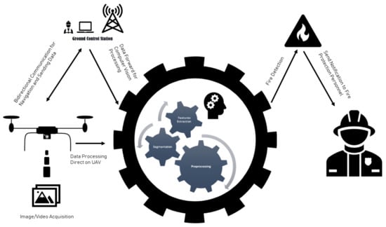 In the next step, in case of a positive result of the artificial intelligence model processes, the system sends an alarm via the UAV or ground support station to the fire protection personnel for further actions. Figure 1 shows the aforementioned flowchart.