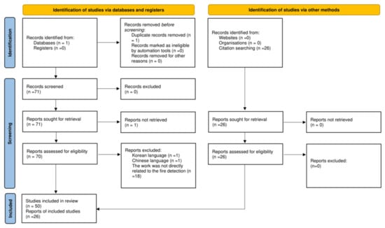 This section consists of two parts. The scope and the research criteria are presented first. The second part contains the taxonomy of the results about the Hardware and Software used in UAV for fire detection purposes. Figure 2 shows the flow diagram followed using the PRISMA (http://prisma-statement.org/ (accessed on 31 July 2021)) methodology.