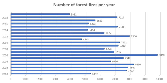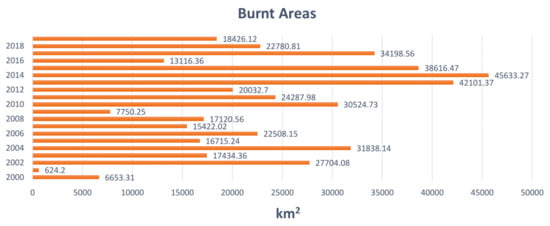 More specifically, the cluster connections shows Canada has a huge impact. According to Figure 4, whose data were taken from the platform Statista (https://www.statista.com/ (accessed on 31 July 2021)), this great impact on Canada is due to the great forest fires issue Canada is facing for decades. The average number of wildfires in Canada is 6704 fires per year, bringing the total number of wildfires in the last two decades to 134,082. Figure 5, whose data were also taken from Statista, shows the number of burned areas by forest fires. It is clear that Canada has been facing a major fire problem for many years and its contribution to solving this problem through the UAVs and Computer Vision is huge. In addition, Greece, Cyprus and Spain are suffering from deforestation through wildfires.