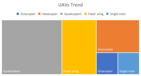The results of the research lead to the conclusion that the implementations of the last decade regarding UAVs and Computer Vision in the field of fire detection are implemented in the largest percentage (70.58%) with drones. In Figure 7, the tree-map for UAVs types used in the reviewed applications is shown.