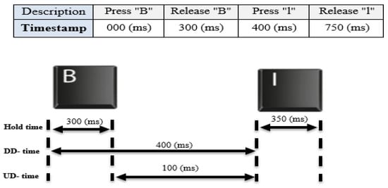 Figure 3 presents an example of these time features extracted for two keys. Based on this example, the hold time for key ‘B’ = 300 − 000 = 300 ms, and for key ‘I’= 750 − 400 = 350 ms. In addition, the DD time (for keys ‘B’ and ‘I’) = 400 − 000 = 400 ms and the UD time = 400 − 300 = 100 ms, respectively.