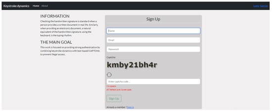 During the enrolment phase of this experiment, the system began to create a biometric template for each user by asking them to enter their credentials (username, email, and password) and to solve a CAPTCHA seven times. Moreover, guidelines appeared in the sign-up and log-in pages, explaining that all characters of the CAPTCHA were lowercase letters with no spaces between them. In addition, the participants were informed that any information entered would only be used for the purposes of the research. Figure 5 depicts a screenshot of the sign-up page.