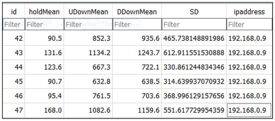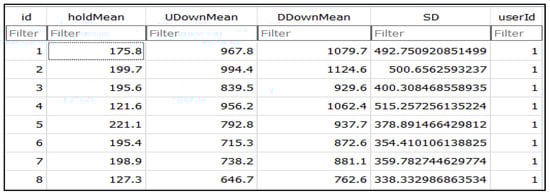 After extracting time features, the collected data were pre-processed to remove outliers and noisy data (i.e., the large amounts of data generated when a user presses two keys simultaneously in error). The server then calculated the mean values for each time feature (hold time, UD time, and DD time) to build the user’s profile, as in Ref. []. The system also assigned each participant a unique ID for their identification, which could also be used to label the data. Thus, the time vectors were categorised based on the user’s label data. In addition, the system provided a fake IP address for each participant because the experiment was conducted on a single laptop.
