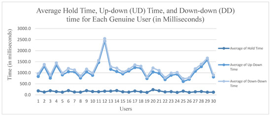 Average hold time, UD time, and DD time for each genuine user.