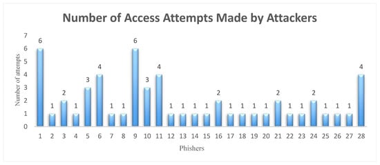 The number of attempts to obtain access to the system was limited to six for each IP address. If this maximum number was exceeded, the IP address would be blocked. Figure 11 presents the number of attempts made by attackers who gained successful access to the system. Conversely, Table 4 displays the IP addresses that were blocked because the maximum number of attempts was exceeded.