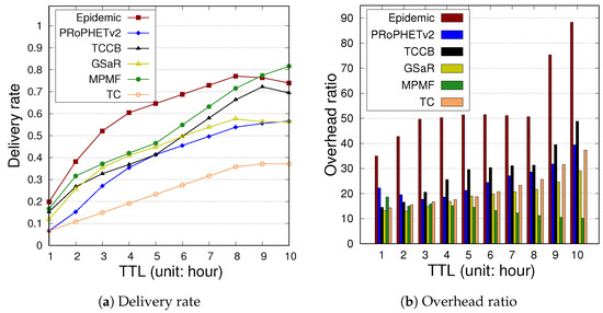 With a longer TTL period, the MPMF will hold messages longer on nodes and induce a limited amount of message replicating and relaying operations. Thus, a buffer overflow can be mitigated so that messages can reach their destinations at higher chances. Although both GSaR and MPMF replicate a message with a limited number of copies to nodes moving closer to the destination, GSaR fails to achieve a sound performance. In GSaR, when a message-carrying node encounters a relay closer to a destination and can deliver a message earlier, it replicates the message to this relay and deletes that message from its buffer. The policy of deleting messages possibly degrades the performance of message delivery. With only one copy left for a message, GSaR will still replicate the message. Those buffer replacement operations possibly cause other messages to be removed and induce more overhead in the network. While TCCB uses temporal closeness and centrality to avoid blind replication, its overhead ratio becomes lower than Epidemic. Epidemic policy replicating a message multiple times increases the possibility that one of the message copies is successfully delivered within the shortest time. At the same time, creating more copies increases the average hop count. This observation is apparent from Figure 9c,d, where Epidemic has a lower latency when the TTL = 5 → 9 h and a higher value of hops for TTL = 1 → 10 h. For the MPMF, a limited number of copies are replicated for each message, which results in lower hop counts than Epidemic and PRoPHETv2. Conversely, messages with a longer TTL remain in the buffer for a longer time, resulting in higher latency. In TC, when a message-carrying node has not encountered other nodes with higher relaying capabilities in some time period, it removes the message from its buffer. By this way, fewer copies of the message are relayed in the network, resulting in lower delivery rate and overhead ratio.