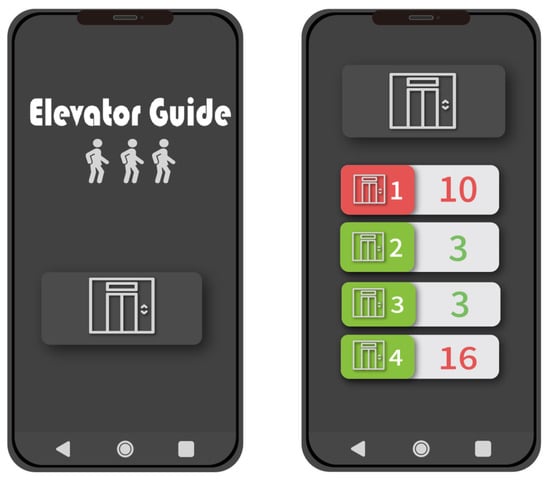This paper presents an image-based indoor elevator people flow counting system that employs visual data to monitor the current passenger flow inside and outside elevators within a building. It simultaneously performs a statistical analysis to determine the number of occupants. The acquired data are transmitted to a server and ultimately displayed on a large screen for all building occupants to observe. The mobile interface design is depicted in Figure 1. The left side of the figure illustrates the main mobile interface. Upon scanning a QR code and accessing the main interface, users can select the elevator icon to view the current elevator waiting status and the number of occupants inside the elevator, as shown on the right side. On the presentation interface for elevator waiting numbers and elevator occupants, the elevator occupancy number is displayed on the right half of the interface. The color of the displayed number corresponds to different levels of occupancy, represented by a color-coded classification into three levels, green, yellow, and red, signifying low to high occupancy levels. Users, upon viewing this interface, can decide whether to use the elevator based on the displayed waiting numbers and elevator occupancy numbers. In addition to the mobile interface, we also designed an electronic screen interface, as depicted in Figure 1. It was created using Mockuphone [], a free tool that can help to wrap app screenshots in different mobile devices. These electronic screens are placed in the elevator waiting halls on each floor. They provide information about the current elevator waiting status and the number of occupants inside the elevator for each floor. The numerical values and color representations on the electronic screen interface correspond to those on the mobile interface and serve the same purpose. By offering this electronic screen interface, users who do not have a mobile phone with a QR code scanner can still directly view the screen to obtain information about the current elevator waiting status and the number of occupants inside the elevator within the building.