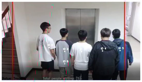 To validate the accuracy of the counting system, we designed various scenarios involving different elevator queue formations and positions of individuals inside the elevator, with configurations of three, five, and eight individuals. The elevator queue formations encompassed horizontal, vertical, diagonal, and criss-cross patterns (as illustrated in Figure 5, Figure 6, Figure 7 and Figure 8). Positions within the elevator were characterized by non-overlapping and overlapping arrangements. Furthermore, scenarios mimicking pedestrian movements within corridors, including walking in the same direction and encountering pedestrian crossings, were considered. To conduct the experiments, cameras were strategically installed in the elevator waiting areas, on the ground floor corridor, and inside staircases on various floors of Engineering Building 5 at the National Yunlin University of Science and Technology. The camera placement for capturing the waiting crowd and the individuals inside the elevator simultaneously (as shown in Figure 9) involved mounting cameras on the walls near the elevator doors at a 45-degree angle to the ground. Each scenario’s personnel arrangement was repeated five times, enabling the calculation of the system’s accuracy for people flow counting within that specific area. The test subjects’ heights ranged between 170 and 180 cm, and the counting of individuals waiting for the elevator and those inside the elevator was performed in real-time using the LOI approach. Based on the aforementioned configurations, we conducted investigations in three different environments, two of which comprised three individuals, while the remaining environment featured five individuals. These scenarios were intended to examine the accuracy of people counting during both the waiting and entering phases of the elevator.