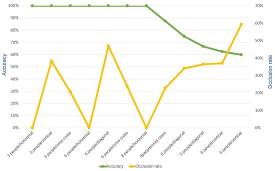 In the equation, the variable  represents the occlusion ratio, and the variable  denotes the collection of values for i individuals, where i = 3, 5, 8 and j represents formations, with j = horizontal formation, vertical formation, diagonal straight-line formation, criss-cross formation, with the first element defined as 1.  signifies the pixel count for the arrangement with i individuals under formation j. The experimental results, illustrated in Figure 4, depict the recognition accuracy represented by the green line and the occlusion ratio represented by the yellow line. The left y-axis indicates the recognition accuracy, while the right y-axis represents the occlusion ratio. Under various scenarios with different numbers of individuals, the impact of occlusion occurrence on the technical outcomes is contingent upon reaching a certain threshold. As depicted in the graph, in most scenarios, if the occlusion of target objects in the image surpasses 30%, there is a high probability of it affecting the counting accuracy. The possible reasons for this observation are twofold. Firstly, within these formations, when individuals enter the designated area, certain angles of the target objects enable the image model to rapidly identify the intended target compared to other angles. This swift identification allows for immediate localization and tracking through positioning algorithms. As a result, even if the target object is subsequently occluded, its trajectory allows the system to determine its continued presence within the area, thereby maintaining the counting accuracy. Secondly, as the original waiting area is initially devoid of individuals, instances might arise where individuals enter the area concurrently, leading to situations where their positions are staggered in the captured image. This can result in the target objects being localized as they enter the waiting area, enabling tracking even if the objects become occluded. Since each target object has already been localized and has not left the area defined by the LOI, the counting result remains unchanged. This experiment demonstrates that when the overall occluded area of the target objects is less than 30%, our counting system achieves an accuracy of nearly 100% across most scenarios.