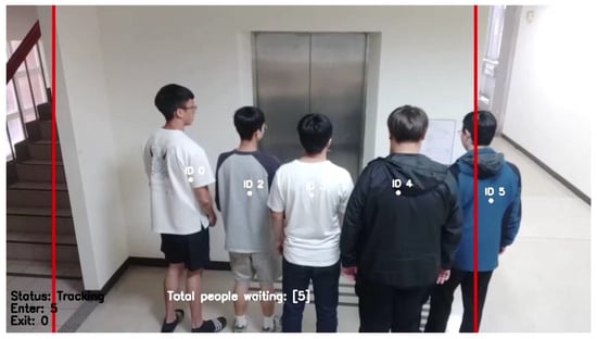 The tracking method involves the centroid tracker algorithm. Upon a target’s initial appearance, its centroid is computed, assigned an ID, and tracked. Subsequently, the Euclidean distance between the centroids in consecutive images is calculated. We assume that the target will continuously appear after the initial appearance and use the calculated Euclidean distances to predict the next position. Our counting method is determined by whether the target’s centroid crosses the LOI. If the target’s centroid is not initially detected when it enters the frame but enters the waiting area later, the algorithm assigns it an ID. Incremental counts occur each time a new ID is added until the target exits the frame. This method focuses on recognizing and tracking the target only when it enters the waiting area, rather than continuously recognizing and counting objects in the image. In this way, we can minimize the counting errors caused by occlusions between the target and other objects.