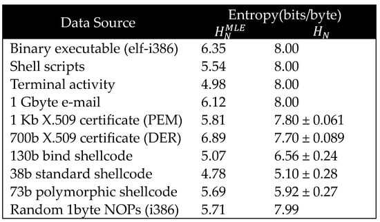 Early analysis of entropy values from several content types, derived from [].  is the sample entropy of a word of length N, MLE stands for Maximum Likelihood Estimator, and HN is the sample entropy. As a point of reference, Figure 4 and Figure 5 provide a more recent analysis of similar content types, where for example, email has an average entropy ranging between 5.40 (POP3) and 5.92 (SMTP).