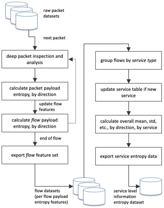 Packet level information entropy can reveal useful insights into the types of content being transported across data networks, and whether that content type is consistent with the communication channels and service types being used [,]. By comparing payload entropy with baseline values, we can ascertain—for example—whether security policy is being violated (e.g., an encrypted channel is being used covertly). To the best of our knowledge, there are no published baseline information entropy values for common network services, and, therefore, no way to easily compare deviations from ‘normal’. In this paper, we analyse several large packet datasets to establish baseline entropy for a broad range of network services. We also present an efficient method for recovering entropy during flow analysis on live or offline packet data, the results of which, when included as part of a broader feature subset, will considerably enhance the feature set for subsequent analysis and machine learning applications.