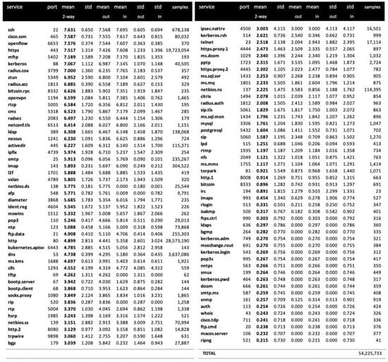 The results of our analysis are shown in Figure 6. This table shows average entropy values for common network services, together with their overall mean, directional mean, and standard deviations In a small number of cases, only one flow direction is recorded, typically because such protocols are unidirectional or broadcast in nature. Note that the service list has been derived dynamically from the datasets cited in Section 3.2. For further information on specific port allocations and service definitions, see [].