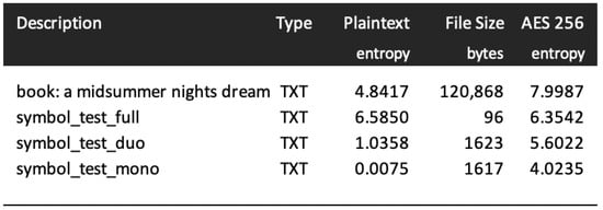 Illustrates the effects of symbolic content on entropy values using four raw text files. The three special ‘symbol_test’ files have limited symbolic alphabets. symbol_test_mono comprises only 1 repeated symbol, with a corresponding entropy close to zero. symbol_test_duo contains two repeated symbols, with a corresponding entropy close to 1. symbol_test_full contains a richer alphabet of 96 symbols (A–Z, a–z, plus punctuation, etc.), with corresponding entropy rising above 6. The final example is a text representation of a book, which has a lower entropy than symbol_test_full because of the frequent symbol repetitions typical in written language (some letters and sequences are far more common than others). Encrypted versions of these files also exhibit wide entropy variations in lower values due to the lack of symbol variety in the source data.