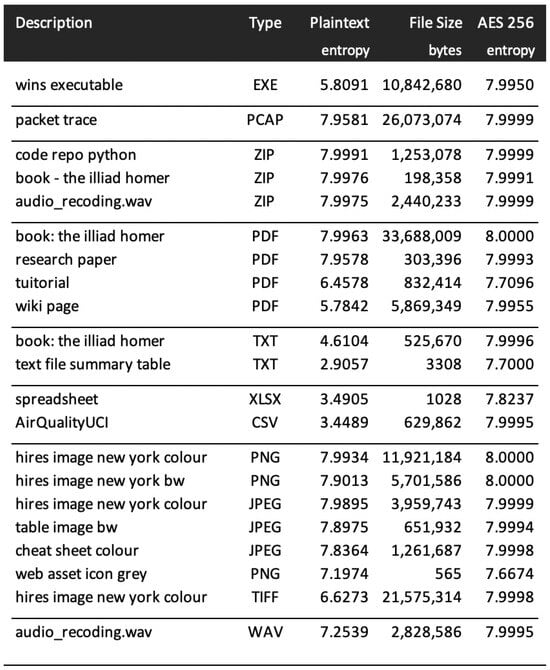 Common file types and entropy values. ‘Plaintext’ here means unencrypted. On the right, we also see corresponding entropies for AES 256 encrypted files. We use just the 256 block size as an illustrative, since a larger block size does not significantly improve the results, given these are close to 8.0 already. Note that zip compressed files and encrypted files tend to have entropies close to 8.