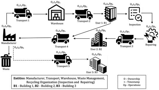 The Ellen MacArthur Foundation [] is one of the non-profit organisations that promotes the principles of the circular economy (CE). They have introduced the idea of a “material passport” (MP) to promote the traceability of products within a circular supply chain. An MP is a document that tracks a product’s journey from the extraction of raw materials to the end of its life. It helps to share information across the supply chain in a timely manner. The MP contains comprehensive information about the composition of a product, its location, and its impact on the environment. Many industry projects have realised the potential of the MP and implemented it in their projects, such as Madaster [], ORMS [], and Buildings As Material Banks (BAMB) []. The use of MPs can help in tracking materials/products in the entire construction supply chain and identifying their origins. Having more details about construction materials can lead to more efficient and less wasteful building construction processes. Furthermore, MPs can also be utilised to dispose of materials properly once they are no longer useful.