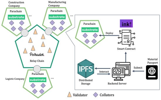 The use case scenario described in Section 3.1 is implemented using material passports (MP), the IPFS for decentralised storage, backend servers, and Polkadot as the blockchain platform as shown in Figure 2. In the designed use case for our blockchain architecture, we define a system in which the manufacturer, logistics, and construction companies operate as separate entities, each with its own dedicated parachain. This specialised blockchain infrastructure enables tailored functionalities and governance models to meet the needs of each ecosystem participant. The manufacturer begins the product’s life cycle by creating an MP that contains all relevant information about the product’s origin, characteristics, and history. This MP is then pushed on the relay chain, which serves as the Polkadot network’s central communication hub, ensuring interoperability across the entire blockchain. Ownership is a critical component of this architecture, and the smart contract deployed on the manufacturer’s parachain records the initial ownership status. It strictly enforces that only the recognised owner can transfer ownership rights, preventing unauthorised transactions.