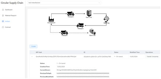 Figure 3 shows the developed web portal. The system is comprised of a front-end interface wherein the stakeholders possess the capability to upload MPs and effectuate the creation and transfer of products among various proprietors. Participants are required to authenticate themselves through their Polkadot wallet account as an identity credential. Manufacturers, in turn, have the capability to produce an MP for their respective products and subsequently commit it to the IPFS, whereby the CID is generated as a reference for the product. The front-end also displays an inventory of products currently owned by the authenticated account holder. Each product also contains a comprehensive record of the product’s history derived from the blockchain, including the preceding owner and its status within the supply chain.