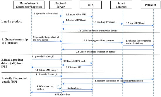 The system’s process is depicted in Figure 4, highlighting four primary operations. They are: adding a product to the blockchain, altering the ownership of a product permanently or temporarily, fetching details about the product (MP), and confirming the product’s details on the blockchain.