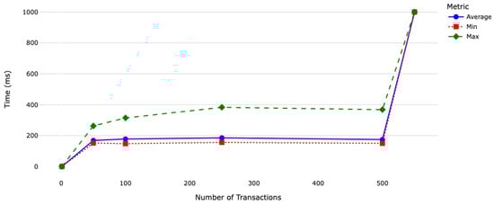 Scalability remains one of the key reasons we selected Polkadot as our blockchain platform. An evaluation was carried out for the two main blockchain operations, adding a product and product verification, which are discussed in the sequence diagram in Figure 4. The scalability test evaluated how the developed model performs under incremental workloads. The system performance for the add_product function can be observed from Figure 5. As the number of transactions increases from 1 to 50, the transaction completion times require an average of 168.5ms, with a minimum and maximum spread from 151.8 ms to 262.7 ms, respectively. This suggests stable performance under lighter loads. Between 50 and 250 transactions, transaction times are reduced as compared to the prior transaction counts. This demonstrates the ability of the implementation to handle higher request loads. At 500 transactions, there is an unexpected dip in the average response time to 174.8 ms, which arises due to system optimisation or variability in load handling between 250 and 500 transactions. For transaction counts above 500, the service starts to degrade, with significantly higher transaction times. The saturation point for this model is thus estimated to be at approximately 500 transactions. An additional 60 s was given for transaction counts above the saturation point, after which tests were terminated to avoid system crashes.