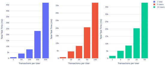 Figure 6 displays the total test time for a verification process across different numbers of users and transactions per user. For a single user, the total time increases from 4073 ms for 50 transactions to 46,898 ms for 500 transactions, which is a significant increase for this number of transactions. With five users, the time taken is initially relatively low, at 816 ms for a single transaction, but this value escalates to 36,842 ms for 100 transactions, showing that the total processing time increases with both the number of users and transactions. For ten users, the total test time begins at 1681 ms for one transaction and reaches 37,905 ms for 50 transactions. These performance results indicate that the system can handle multiple transactions and users, but the total test time rises significantly with increased load.