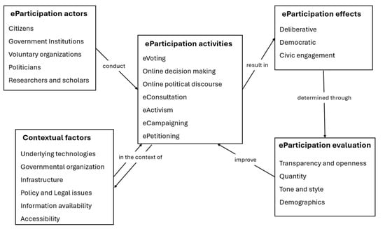 In conclusion, as articulated by [,], the eParticipation field is characterized by diverse concepts. Specifically, the conceptual framework for eParticipation can be delineated by elucidating its (a) actors, (b) activities, (c) contextual factors, (d) effects, (e) evaluation processes, and (f) the interrelations among them.
