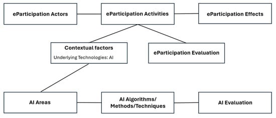 Based on the above, we present in Figure 2 the analysis framework used in our study. This is based on the conceptual model proposed by [], albeit enhanced with concepts from the AI literature. This model will constitute the basis for the analysis of the scientific literature on the use of AI in eParticipation.
