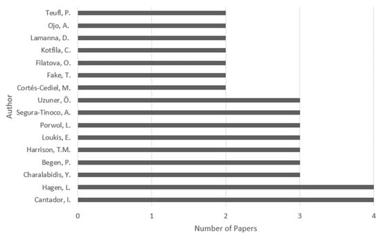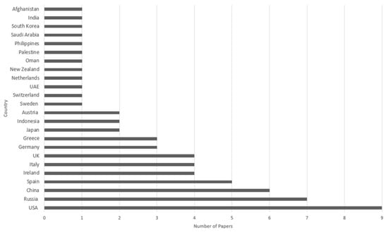 Figure 5 presents the number of papers per author (for authors with more than two papers). In total, 121 authors contributed to this research area, coming from 24 different countries (Figure 6). A few research papers were written by multinational teams.