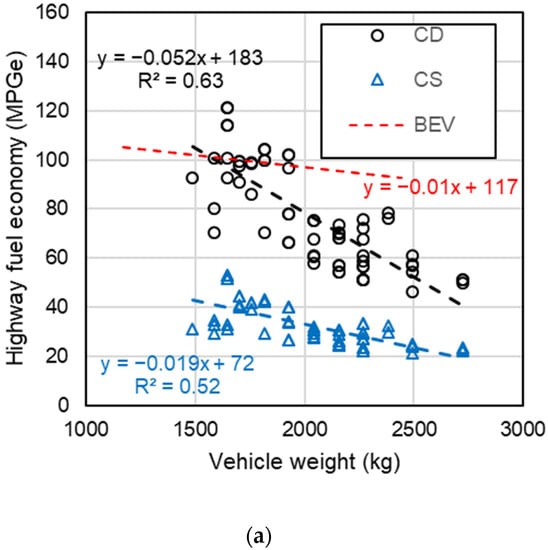 The highway fuel economy of PHEVs in CS mode depended less on vehicle weight compared to that of PHEVs in CD mode. Weight dependency of highway fuel economy for PHEVs in CS mode was similar to that of BEVs but the fuel economy in CS mode was less than 50% than that of BEVs at the same vehicle weight.
