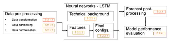 Firstly, a data pre-processing step, explained in Section 3.1, is needed in order to transform, divide, and normalize the data. Then, Section 3.2 focuses on the neural networks used to forecast. It includes a technical background, an in-depth analysis on the input features, and a summary on the different neural networks’ configurations. Finally, a post-processing of the forecast in Section 3.3 and a model performance evaluation in Section 3.4 are provided.